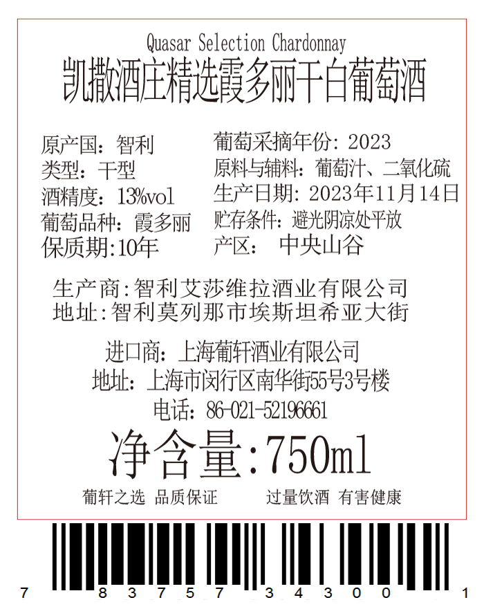 葡萄品种 | 霞多丽(chardonnay) | 酒精度 | 13%/13% | 酒体 | 饱满 |