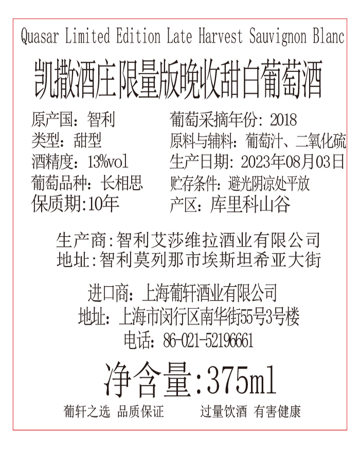 葡萄品种 | 长相思 | 酒精度 | 13% | 酒体 | 饱满,持久 |