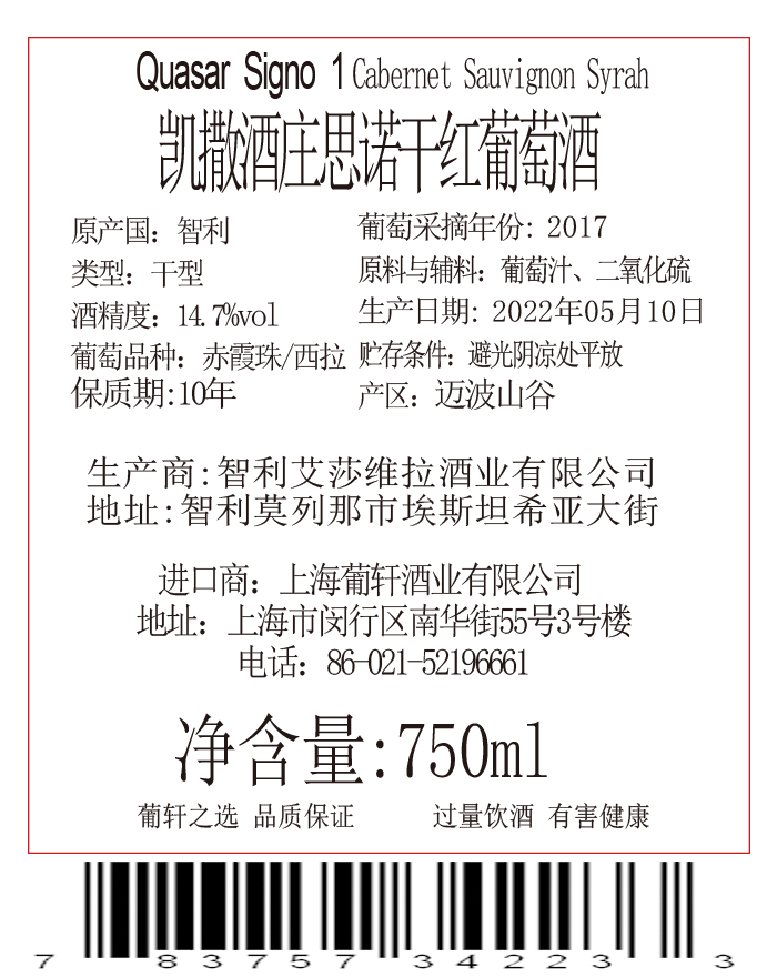 葡萄品种 | 85%赤霞珠(Cabernet Sauvignon) 15%西拉(Syrah) | 酒精度 | 14.7% | 酒体 | 强壮 |