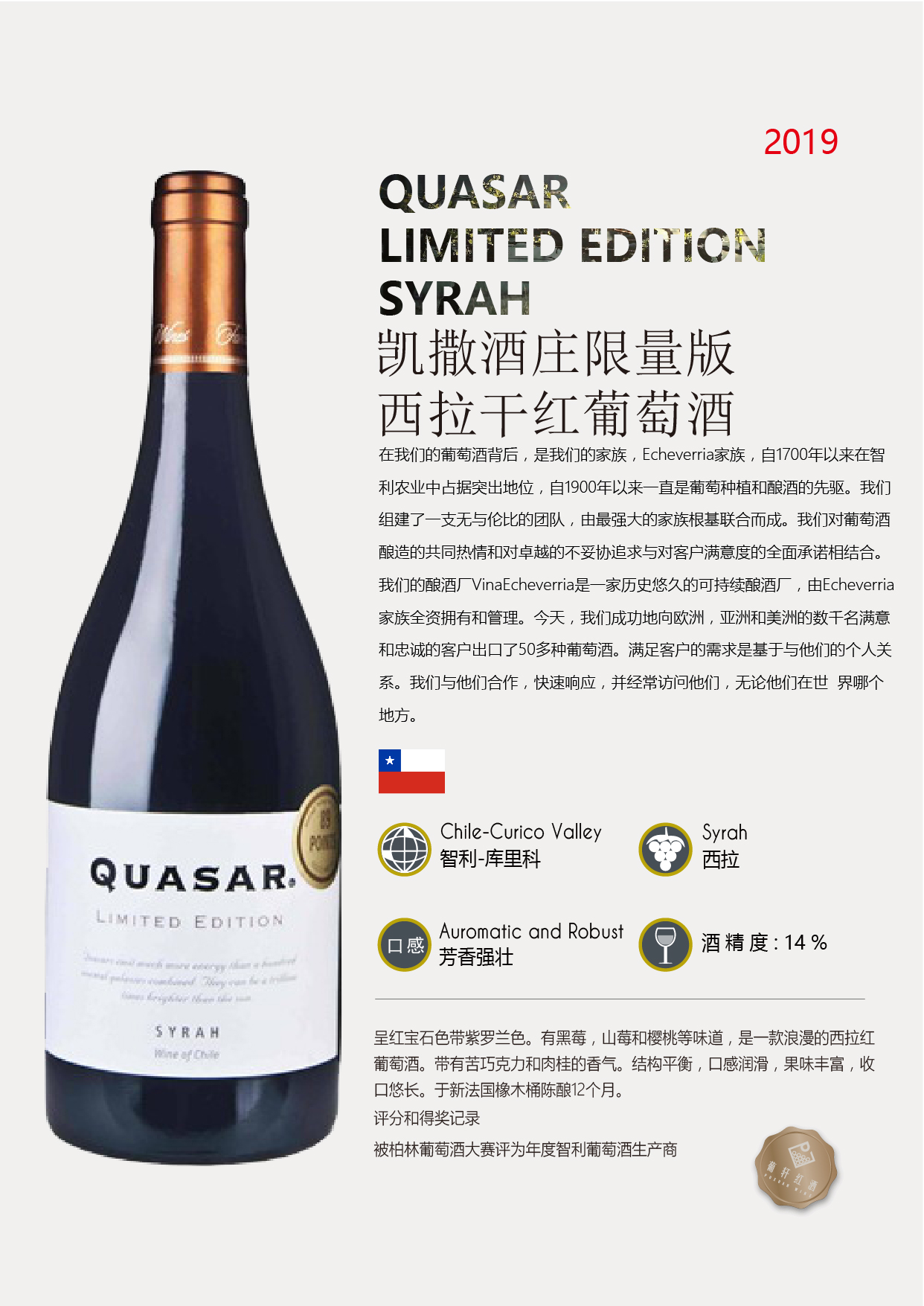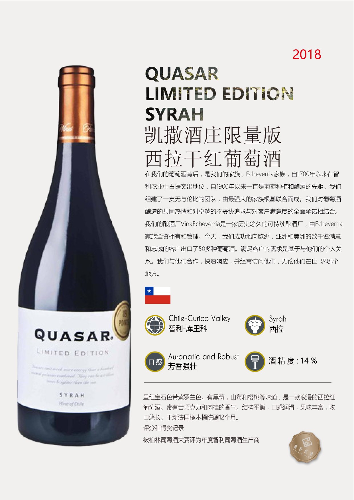 葡萄品种 | 西拉 | 酒精度 | 14%/14% | 酒体 | 适中 |
