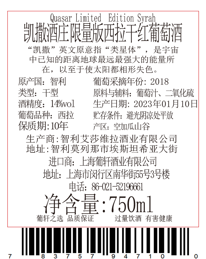 品饮记录 | 呈红宝石色带紫罗兰色。有黑莓,山莓和樱桃等味道,是一款浪漫的西拉红葡萄酒。带有苦巧克力和肉桂的香气。结构平衡,口感润滑,果味丰富,收口悠长。于新法国橡木桶陈酿12个月。 |