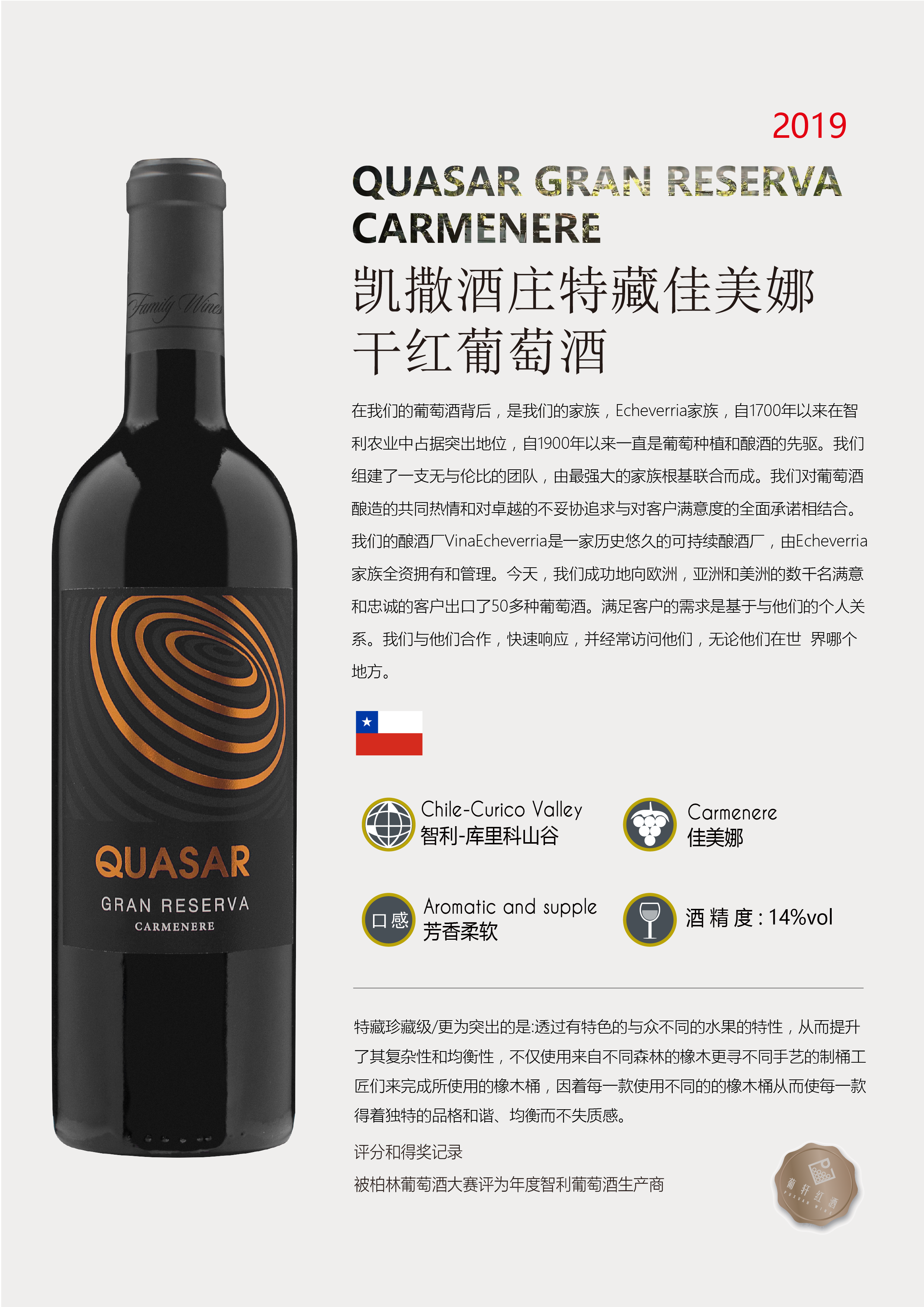 橡木桶陈酿时间 | 12个月法国橡木桶中陈酿 | 葡萄采摘年份 | 2019年 | 产品类型 | 干红 |