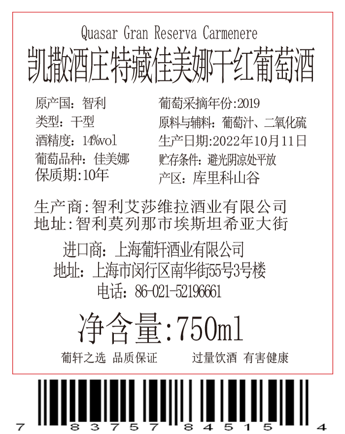 葡萄品种 | 佳美娜(Carmenere) | 酒精度 | 14% | 酒体 | 圆润 |