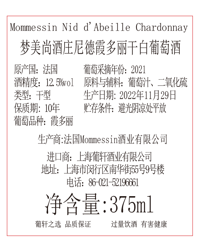 橡木桶陈酿时间 | 葡萄采摘年份 | 2021年 | 产品类型 | 干白葡萄酒 | |