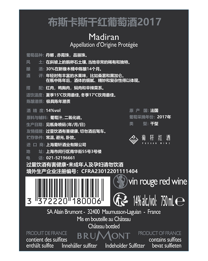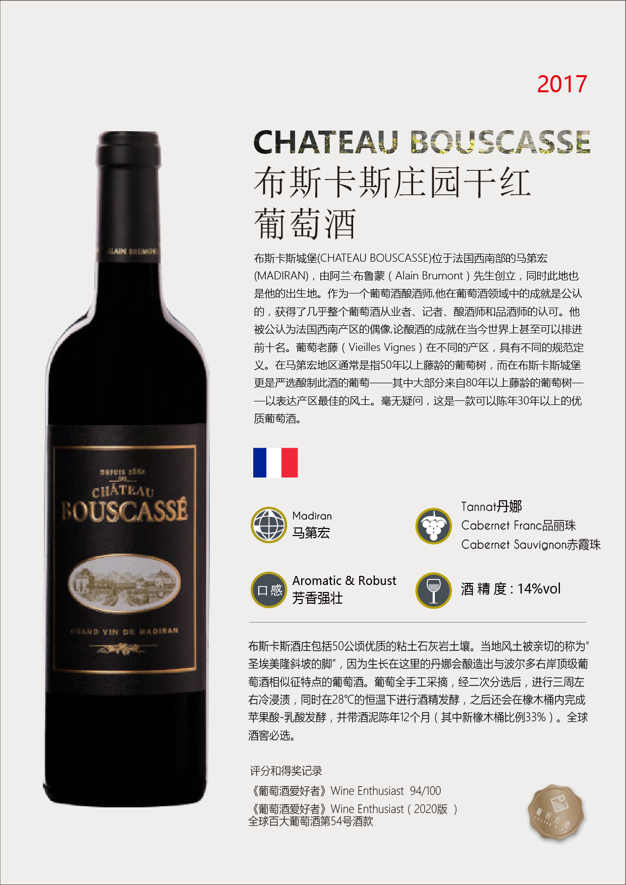 葡萄品种 | Tannat丹娜 Cabernet Sauvignon赤霞珠 Cabernet Franc品丽珠 | 酒精度 | 14%vol/14%vol(2018/2017) | 酒体 | 丰满 |