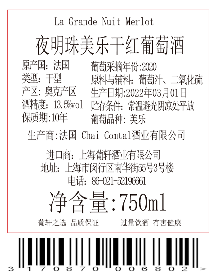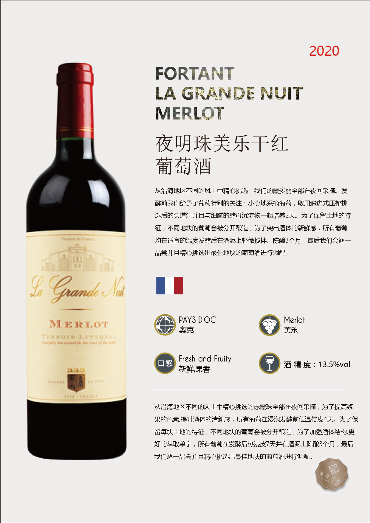 葡萄品种 | 美乐 | 酒精度 | 13.5% | 酒体 | 饱满 |