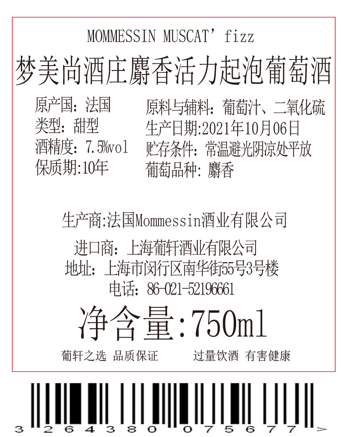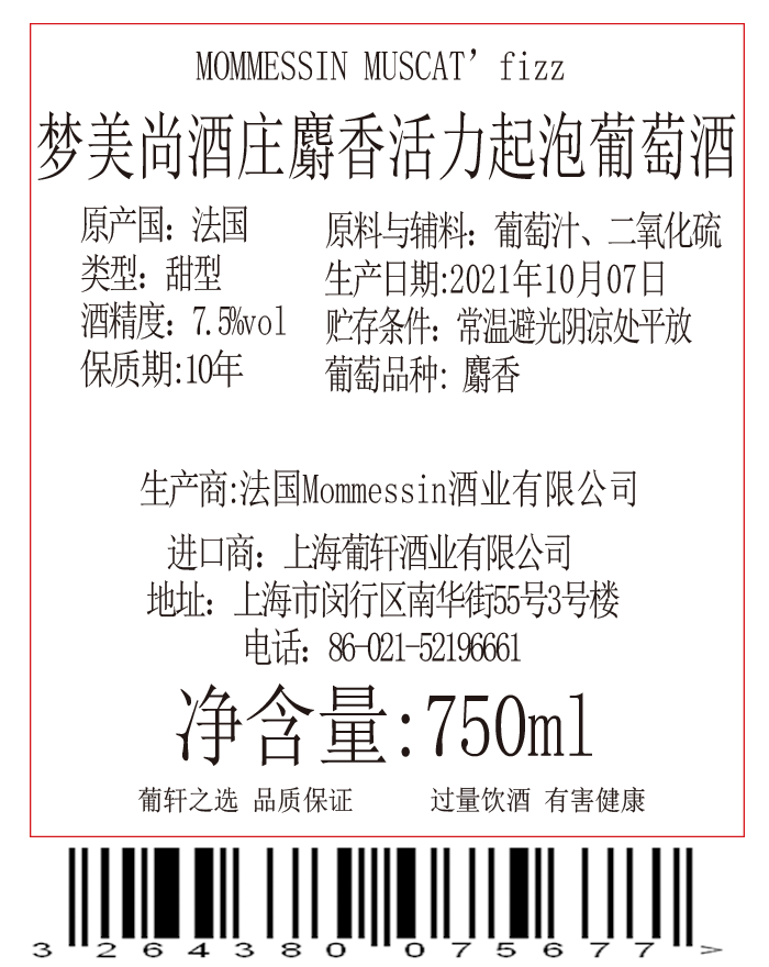 葡萄品种 | Muscat 麝香 | 酒精度 | 7.5%vol | 酒体 | 轻盈 |