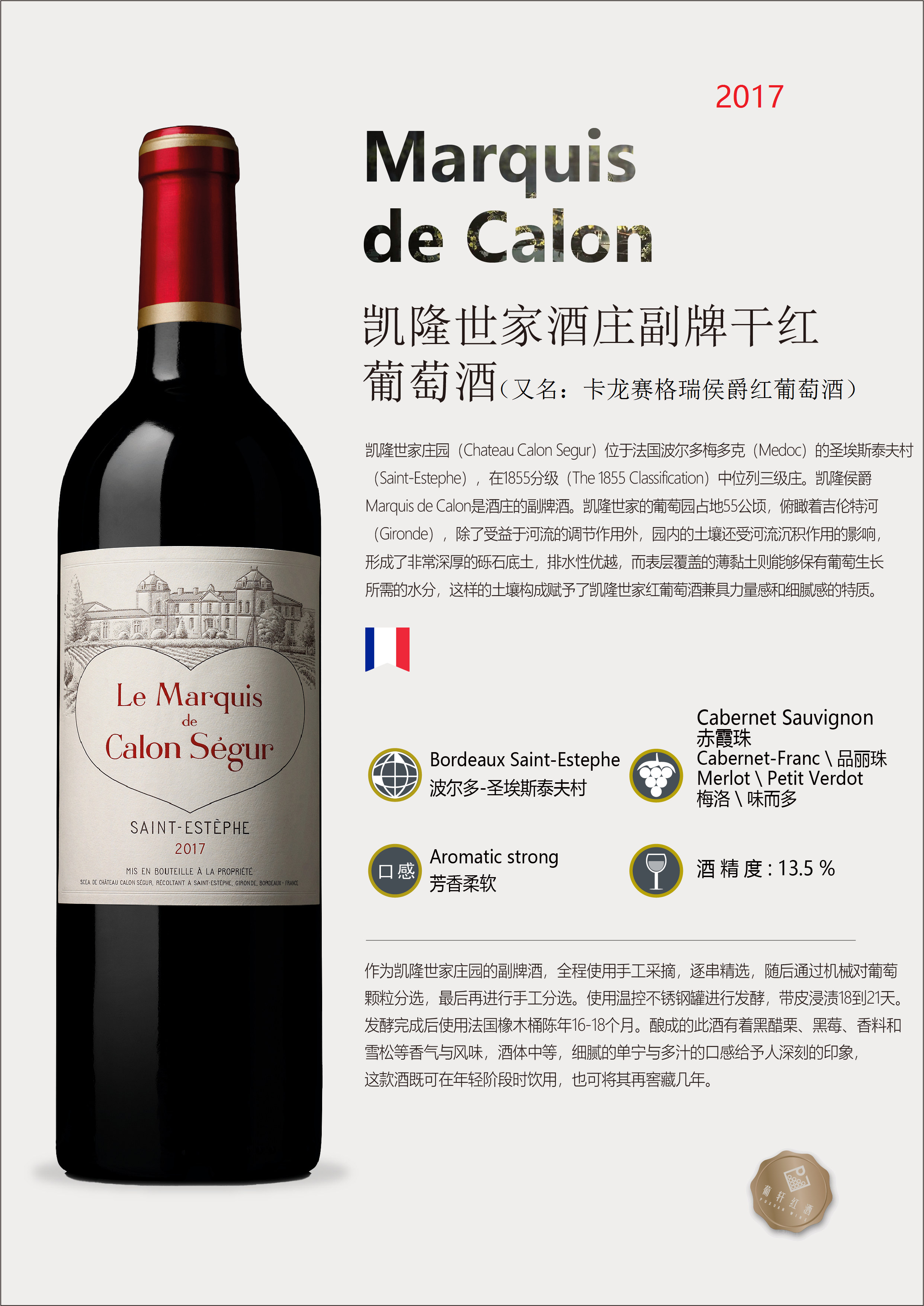 葡萄品种 | 赤霞珠 Cabernet Sauvignon, 美乐 Merlot,品丽珠 Cabernet Franc,小维铎 Petit Verdot | 酒精度 | 13.5%/13.5%/14.5% | 酒体 | 中等 |