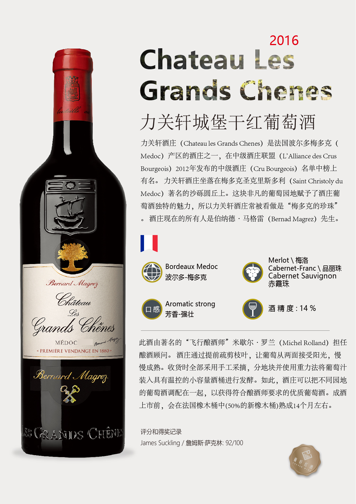 卖点 | 詹姆斯·萨克林93/100 | 级别 | 梅多克(Medoc)中级庄(CruBourgeois) | 酸度 | 中等 |