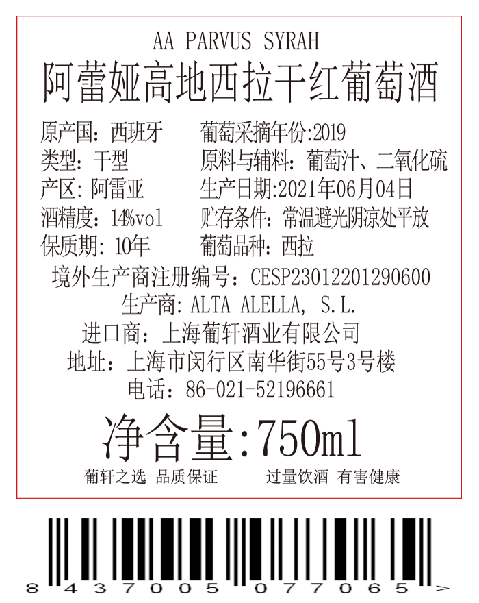 葡萄品种 | 西拉Syrah | 酒精度 | 14% | 酒体 | 清新且有现代感 |