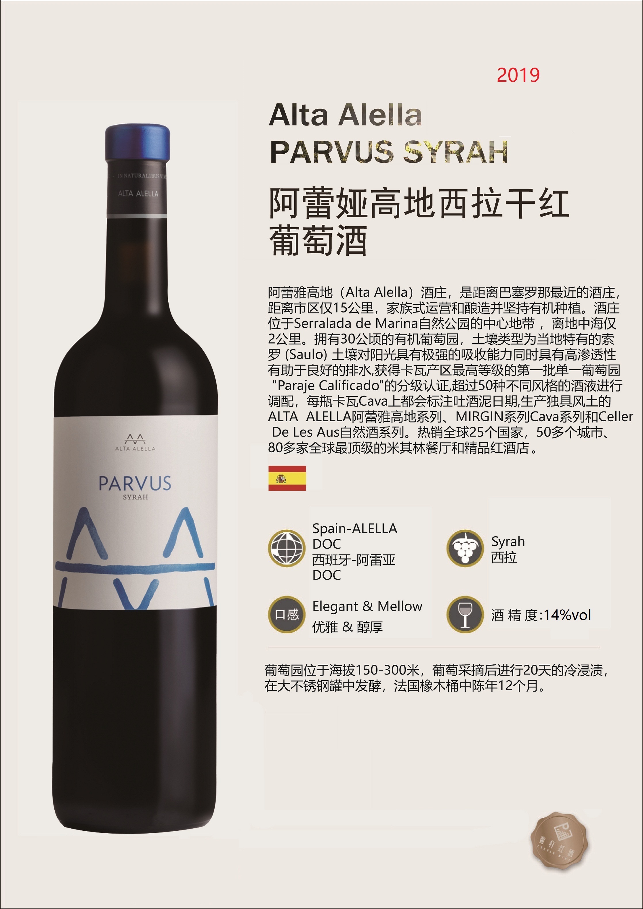 橡木桶陈酿时间 | 12个月橡木桶陈酿 | 葡萄采摘年份 | 2019年 | 产品类型 | 干红葡萄酒 |
