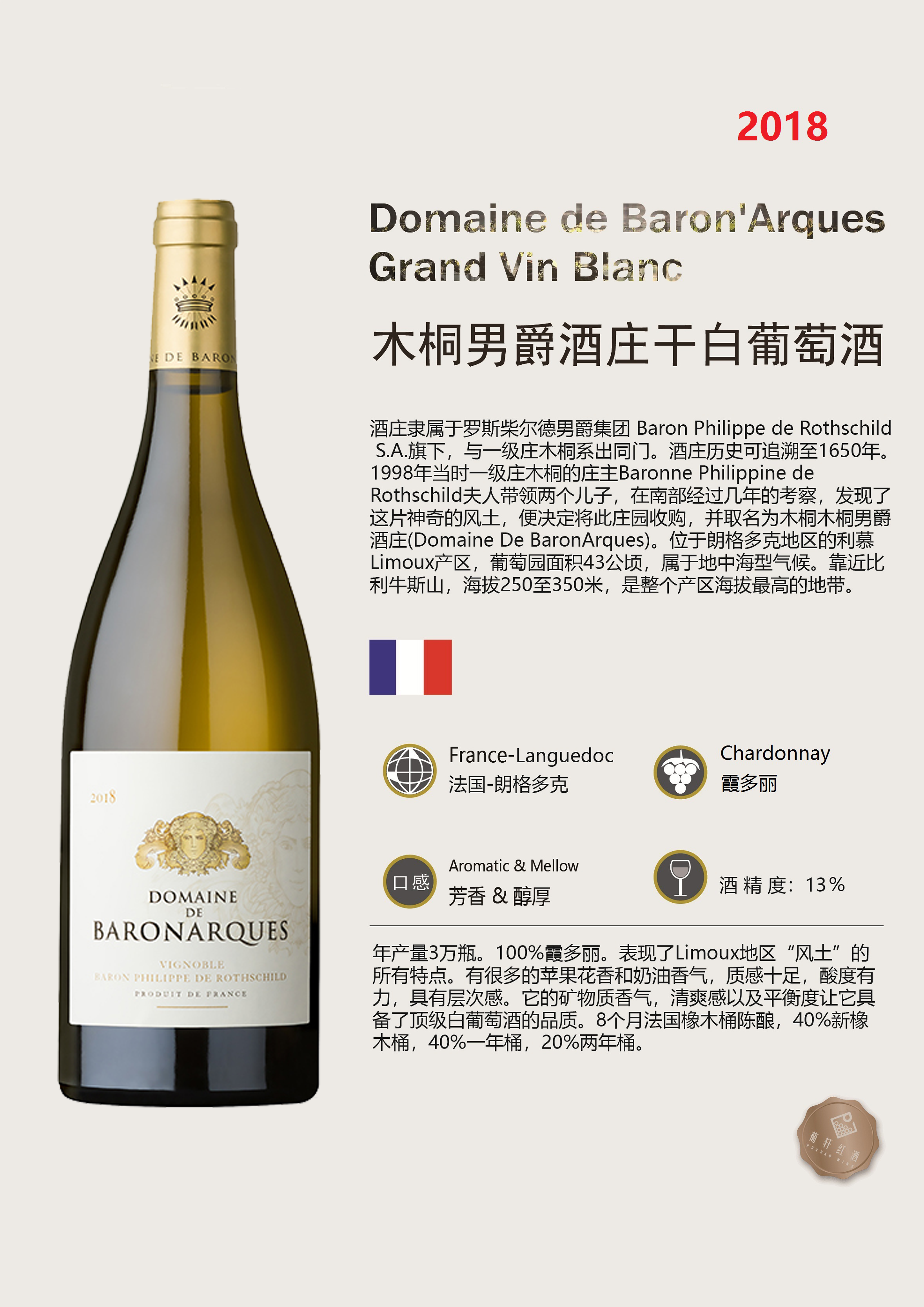 卖点 | 酒精发酵和之后的陈酿都在橡木桶中完成,时间总长为9个月 | 级别 | AOC | 酸度 | |