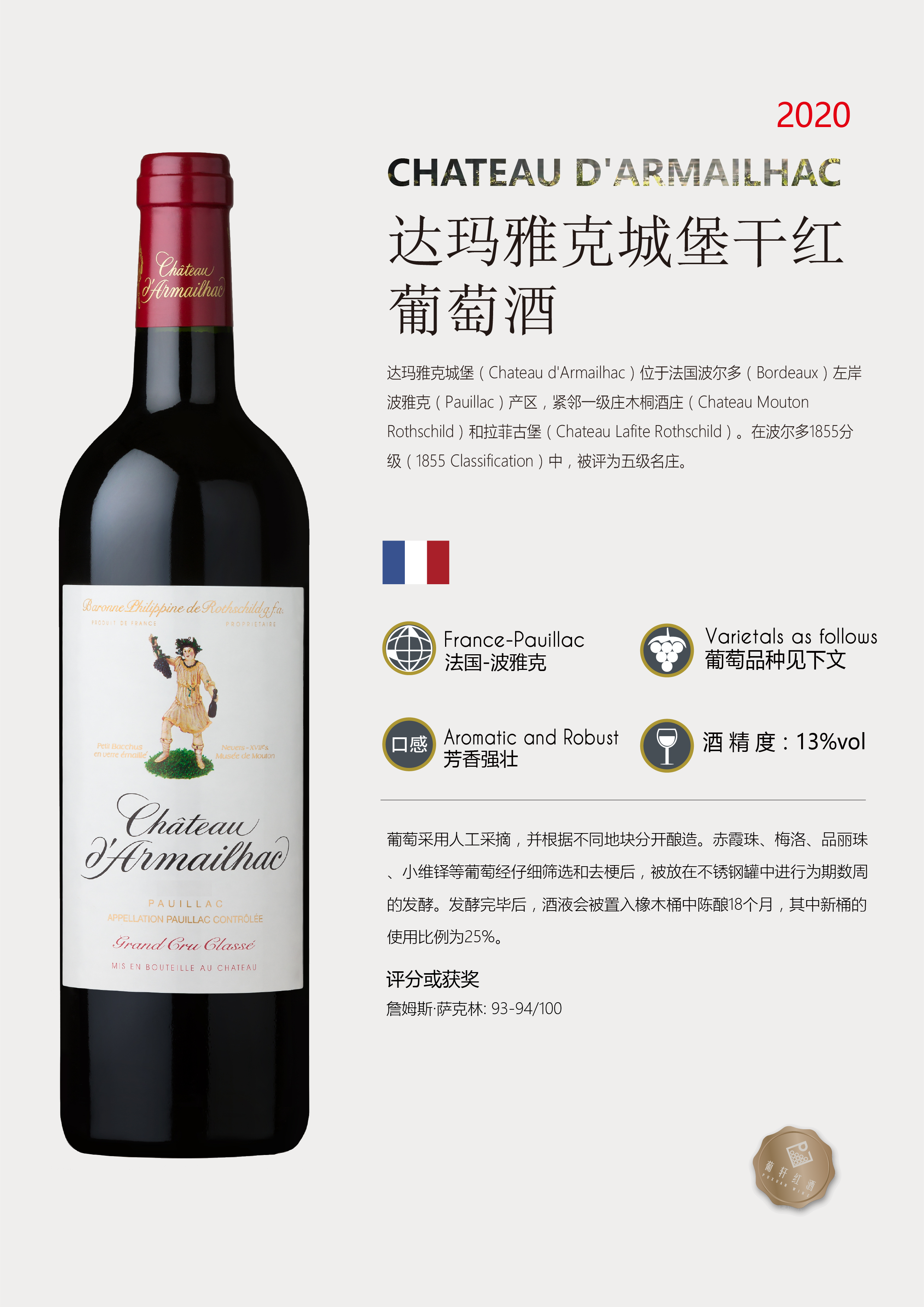 卖点 | 波尔多1855分级(1855 Classification)中,被评为五级庄(Fifth Growth) | 级别 | AOC | 酸度 | 中等 |