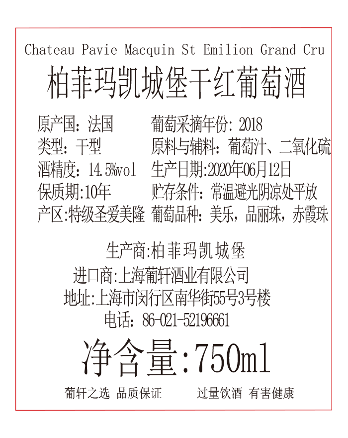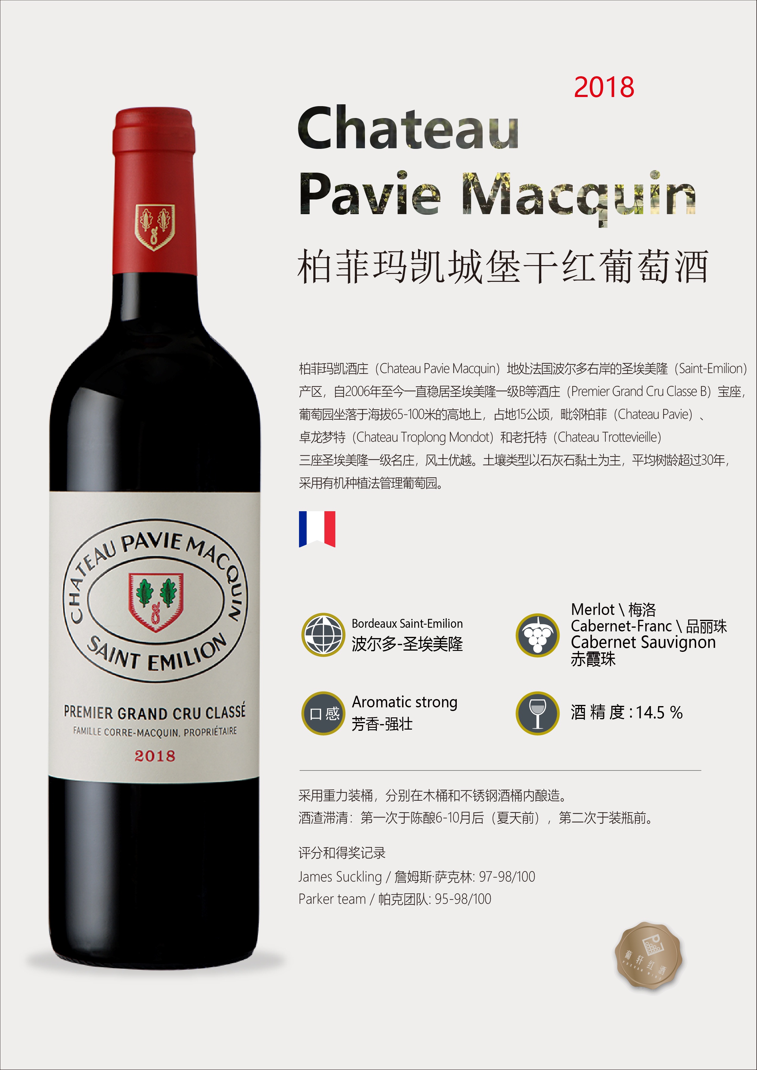 葡萄品种 | 美乐 Merlot, 品丽珠 Cabernet Franc 赤霞珠 Cabernet Sauvignon | 酒精度 | 14.5% | 酒体 | 中等 |
