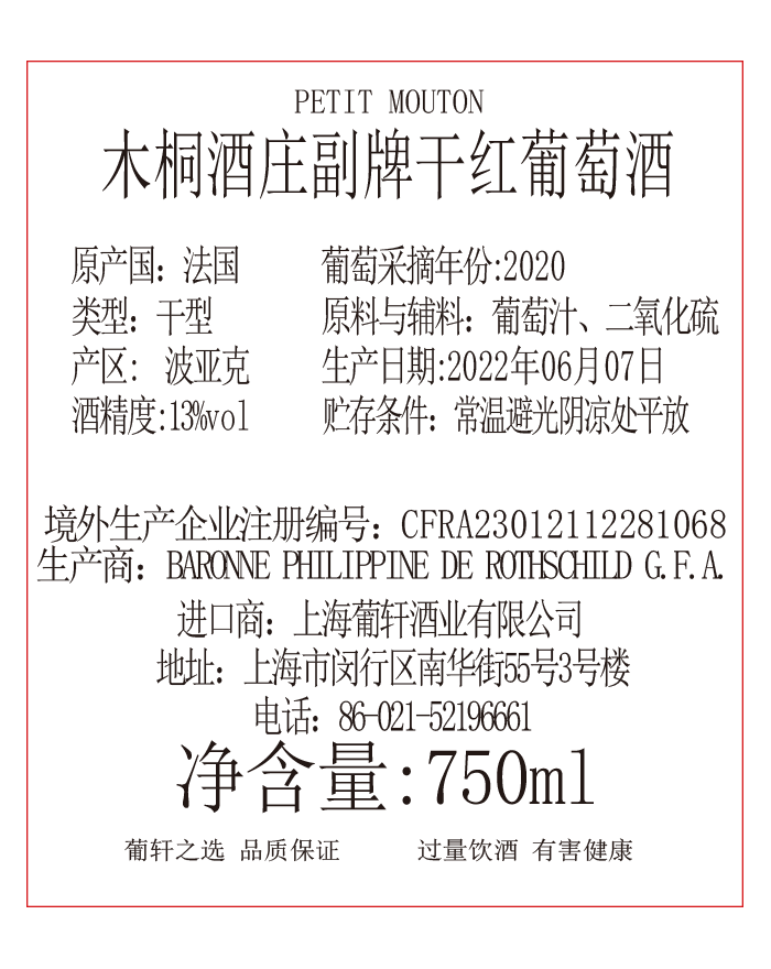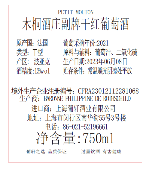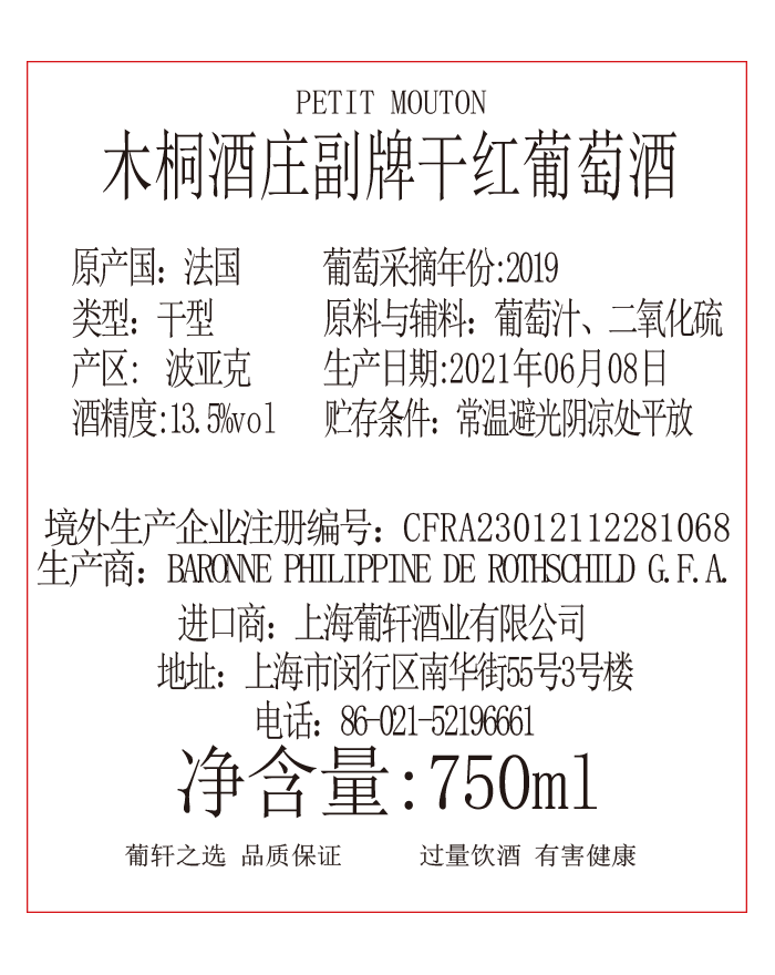 酒体颜色 | 颜色深浓,泛着紫色光泽。 | 包装规格 | 6/木箱 | 口感 | |