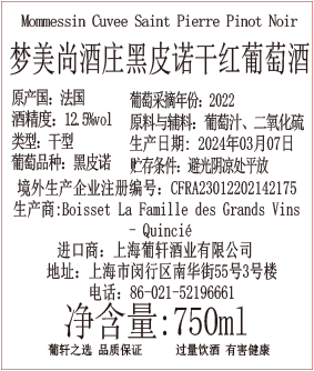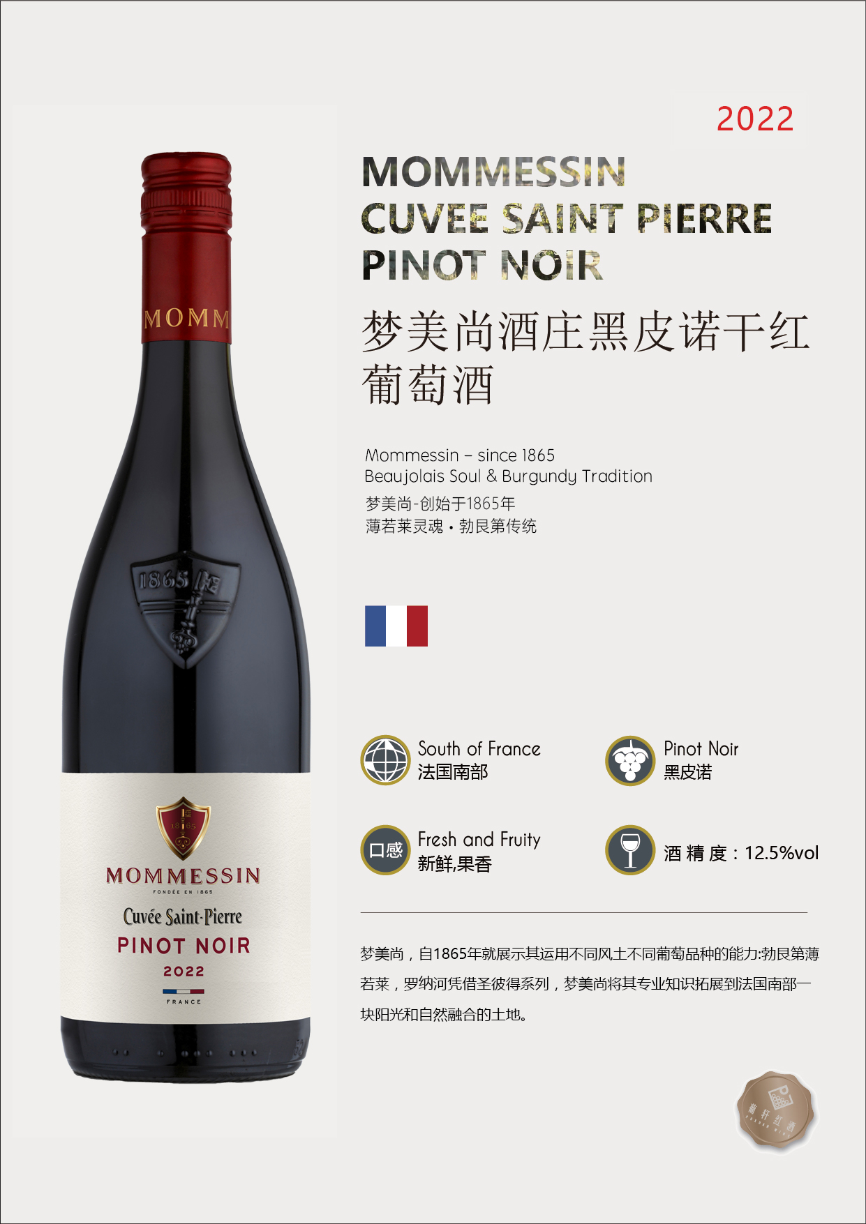 葡萄品种 | Pinot Noir 黑皮诺 | 酒精度 | 12.5% | 酒体 | 中等 |