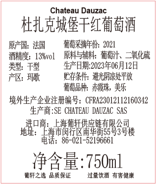 葡萄品种 | 赤霞珠 Cabernet Sauvignon, 美乐 Merlot,品丽珠 Cabernet Franc,小维铎 Petit Verdot | 酒精度 | 13.5% | 酒体 | 中等 |