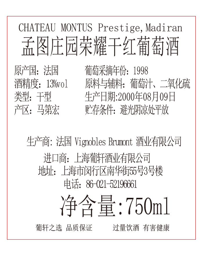 橡木桶陈酿时间 | 24个月 | 葡萄采摘年份 | 1998/1999/2000/2001/2002/2012 | 产品类型 | 干红葡萄酒 |