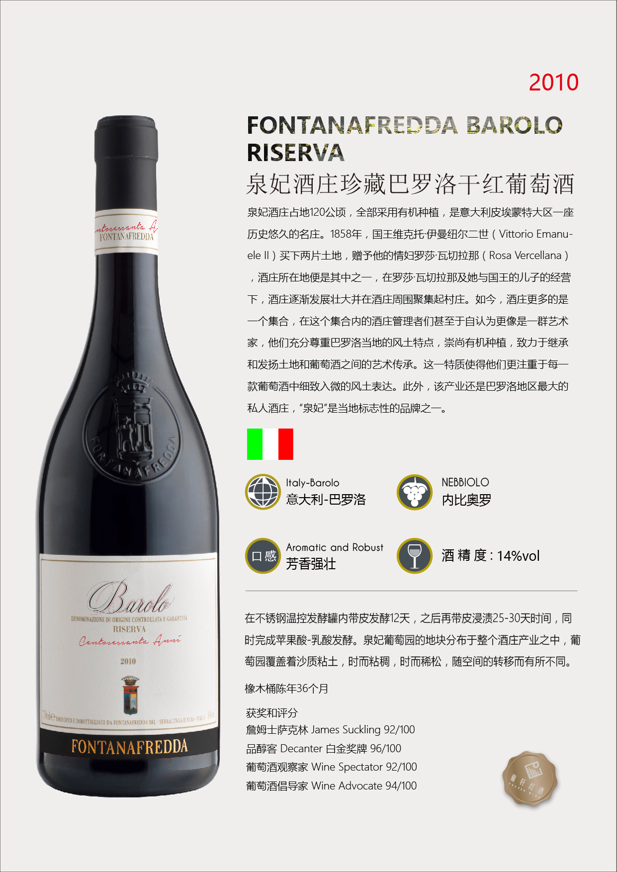 橡木桶陈酿时间 | 36个月 | 葡萄采摘年份 | 2010年 | 产品类型 | 干红葡萄酒 |