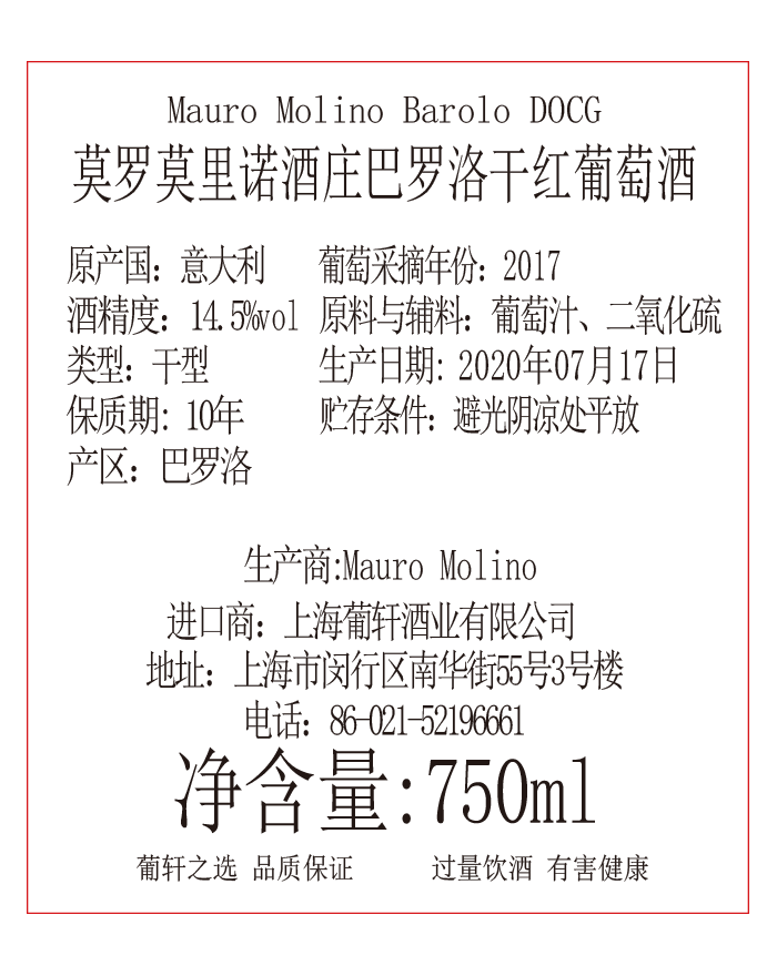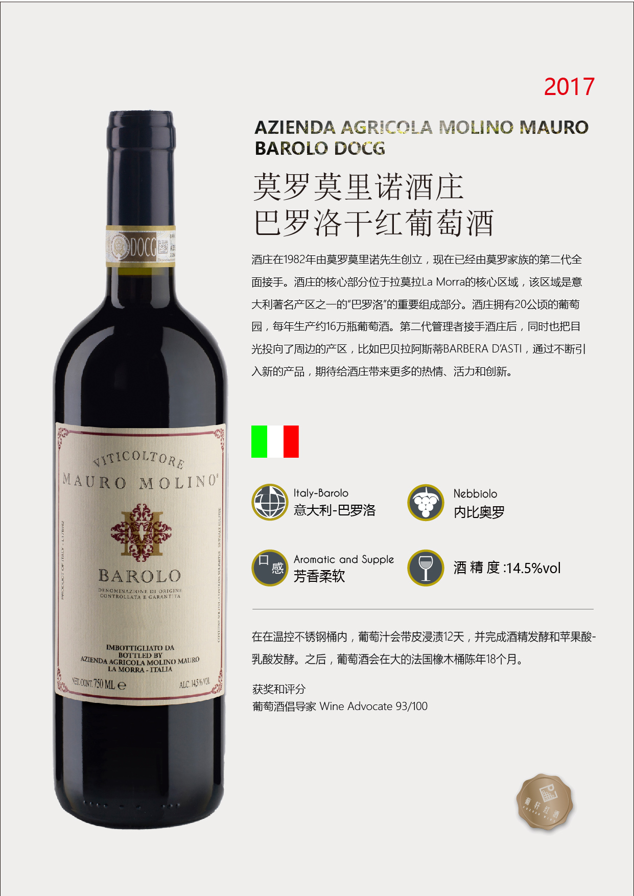 葡萄品种 | 内比奥罗Nebbiolo | 酒精度 | 14.5% | 酒体 | |