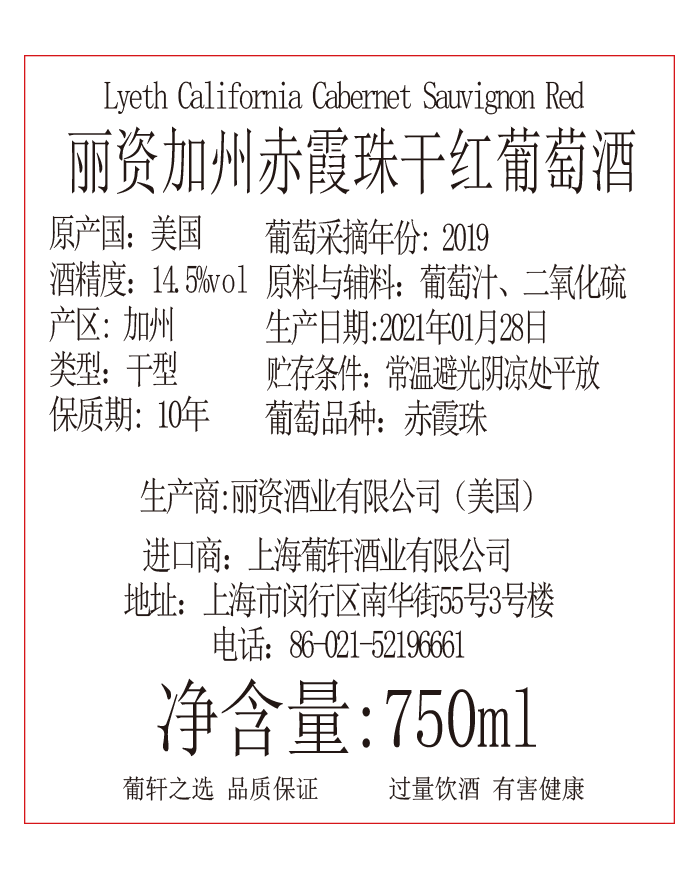 橡木桶陈酿时间 | 葡萄采摘年份 | 2019年 | 产品类型 | 干红葡萄酒 | |