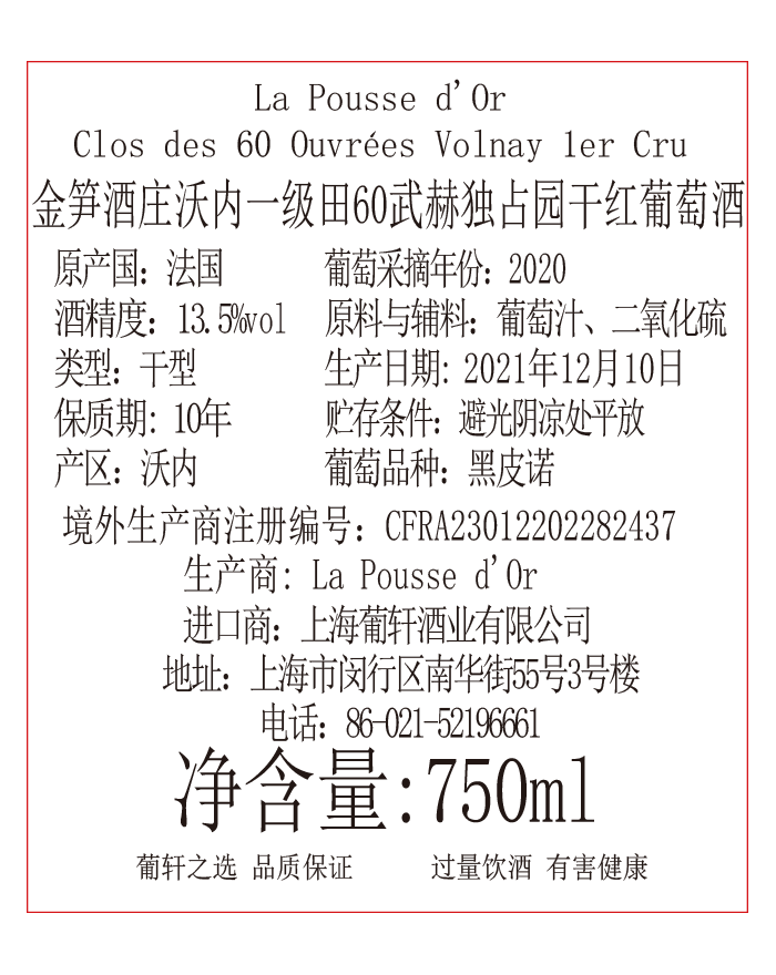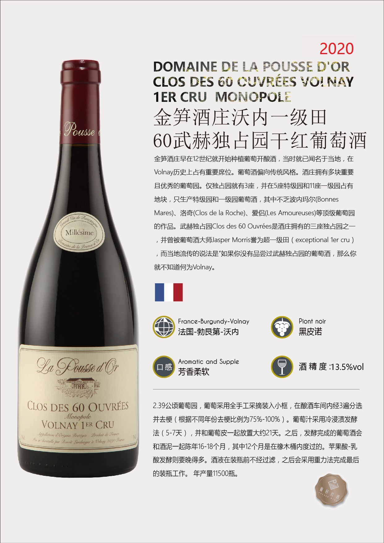葡萄品种 | 黑皮诺Piont noir | 酒精度 | 13.5% | 酒体 | |