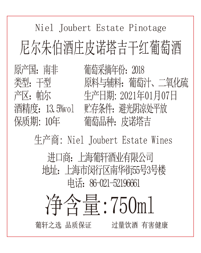 酒体颜色 | 石红色 | 包装规格 | 6/纸箱 | 口感 | 方向柔软 |
