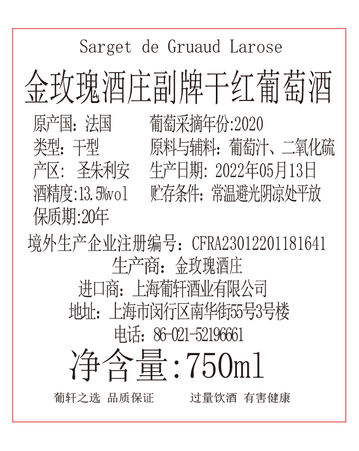 酒体颜色 | 酒红色 | 包装规格 | 6/纸箱 | 口感 | 芳香强壮 |