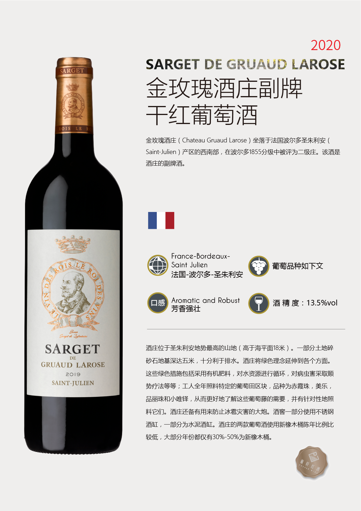 品饮记录 | 这款酒选用了经典的波尔多红葡萄品种混酿,一般会使用橡木桶陈酿14个月左右。该酒散发着红色水果和黑色水果的气息,还有橡木桶陈酿带来的烘烤香气,陈年后会发展出复杂的泥土、烟熏和蘑菇等风味。比正牌酒更早进入适饮期,同时也有一定的陈年潜力。 |