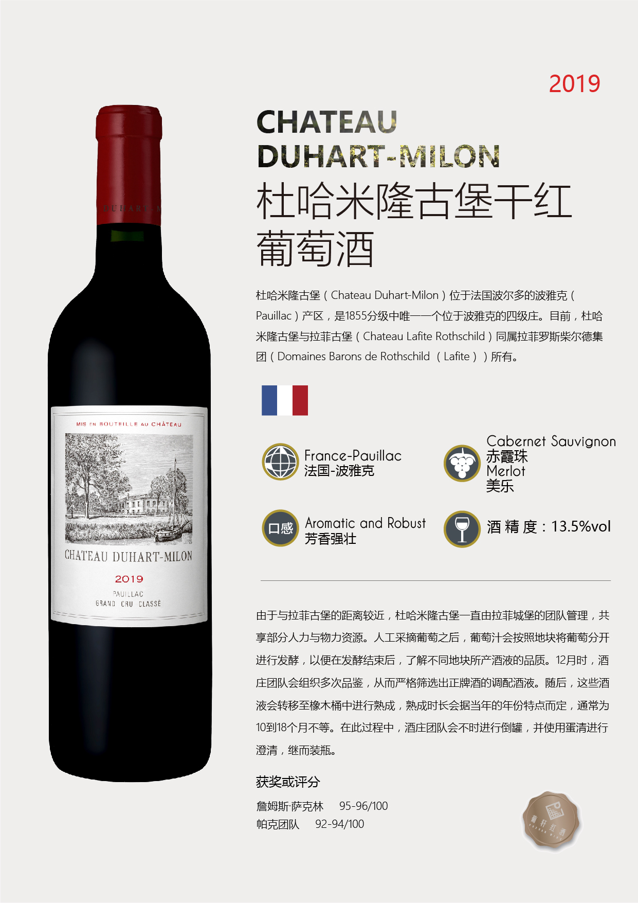 品饮记录 | 夹杂着黑加仑子、紫罗兰、甘草和肉桂的味道。在口感上,单宁显得成熟而柔和,展现出强健而稳固的结构,非常柔软,还有着完美的均衡感,余味持久。 |