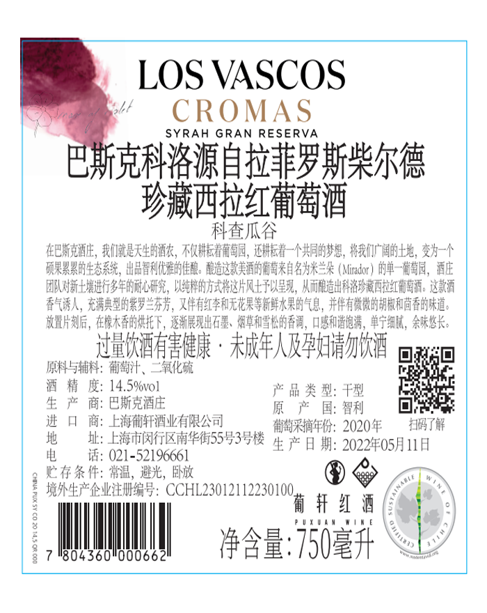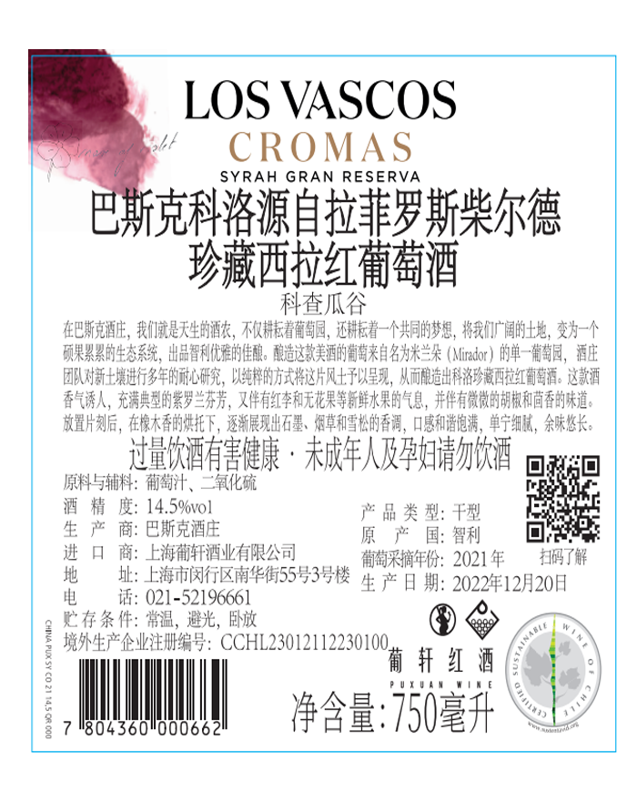 酒体颜色 | 紫色 | 包装规格 | 6/纸箱 | 口感 | 芳香强壮 |