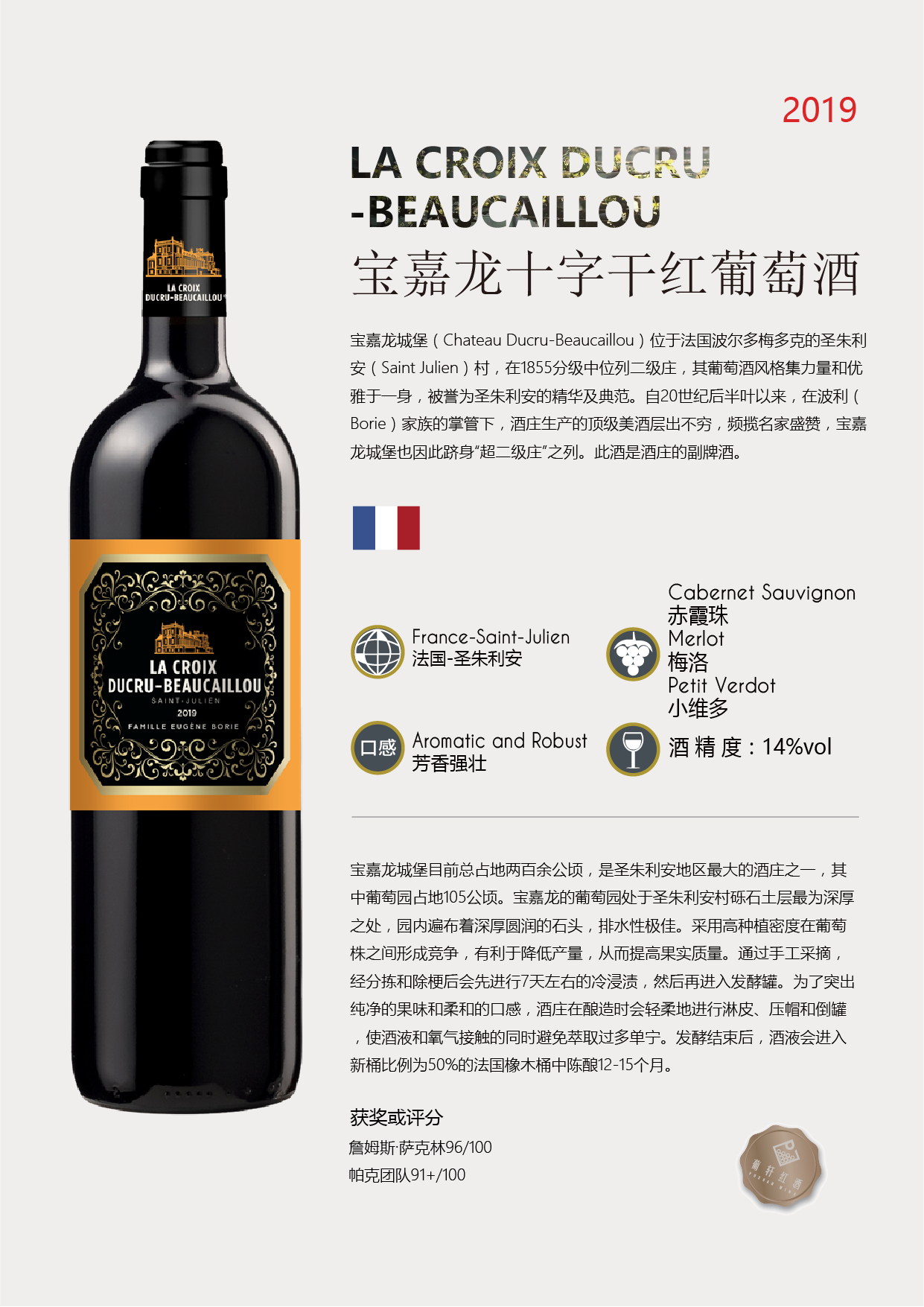 荣誉/评分 | 詹姆斯·萨克林96/100 帕克团队91+/100 | 品尝温度 | 产品规格 | 750ml | |