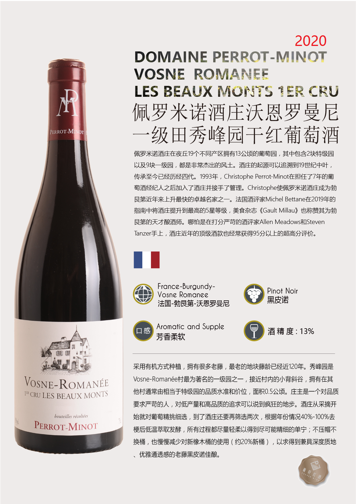 品饮记录 | 这款秀峰园的香气极为优雅,紫罗兰、红醋栗和玫瑰花瓣的香气层层铺展开来,入口单宁强劲,架构感十足,余韵连绵不绝,风格纯净,是一款严肃而大气的酒。秀峰园是沃恩罗曼尼村公认的相当于特级园的品质水准的酒。 |