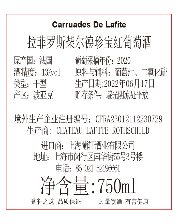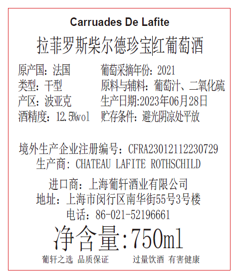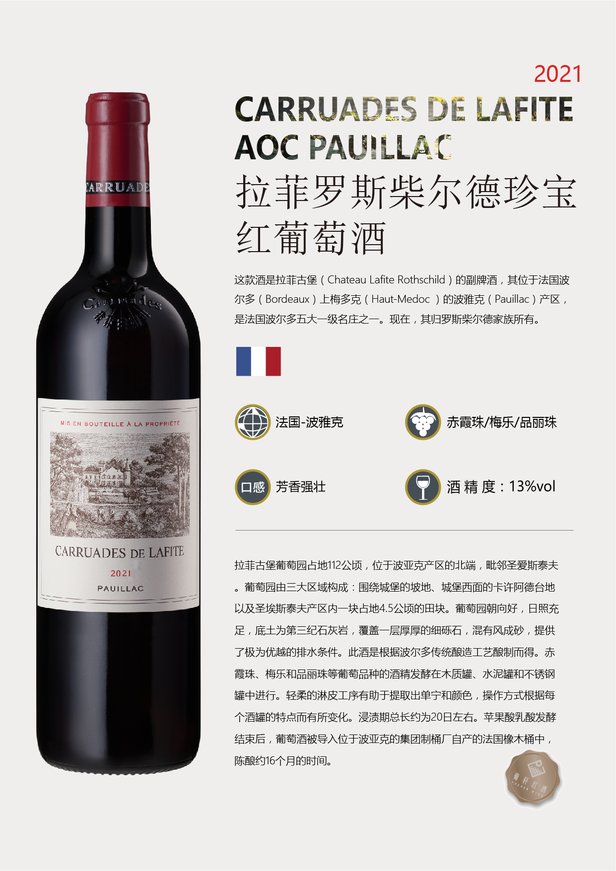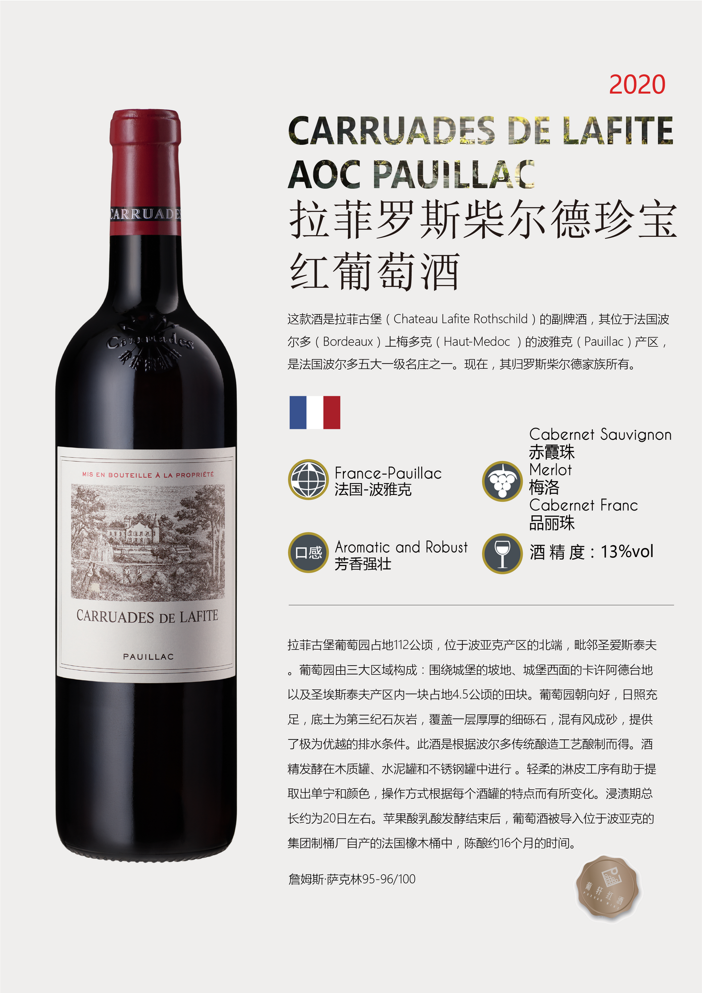 品饮记录 | 酒裙美丽,颜色深邃。香气带着这一年份的典型特征,成熟又不失清爽,溢出满满的黑醋栗和黑果香。葡萄酒入口直率,随后,逐渐在口中攻城掠地,充分表现自身的饱满度。单宁细腻又精准。高比例的赤霞珠(68%)和品丽珠(5%)让整个余韵充满了张力。这是一款丰满馥郁的拉菲罗斯柴尔德珍宝,陈年潜力极好,无疑会在未来的6到8年里绽放出异彩。 |