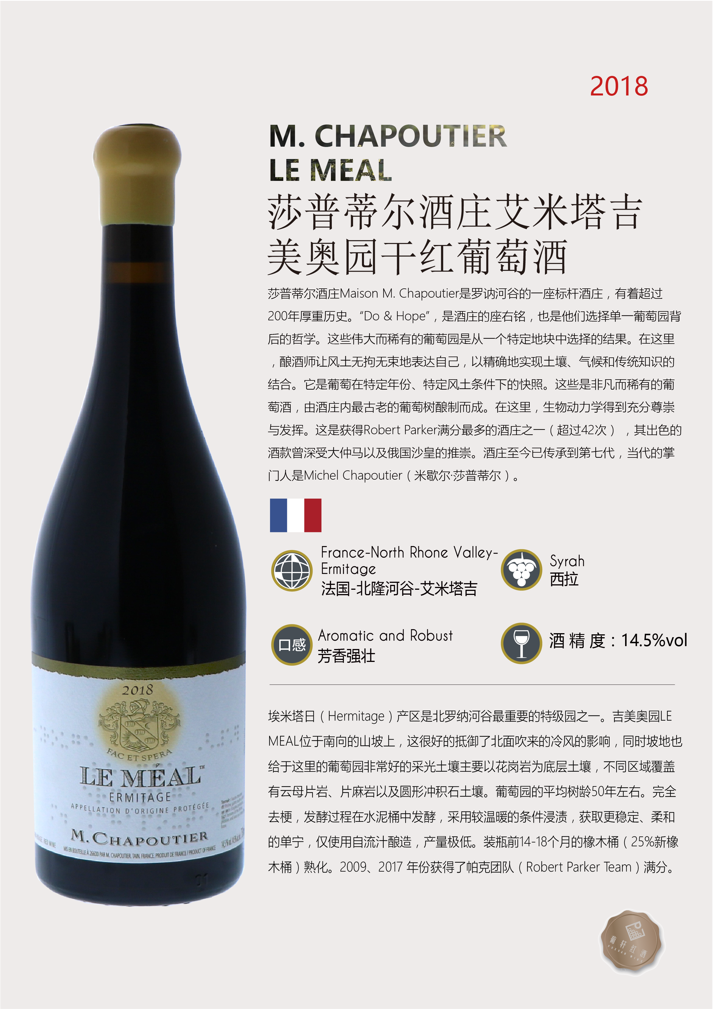 卖点 | 2009、2017 年份获得了帕克团队(Robert Parker Team)满分 | 级别 | AOC特级村 | 酸度 | |