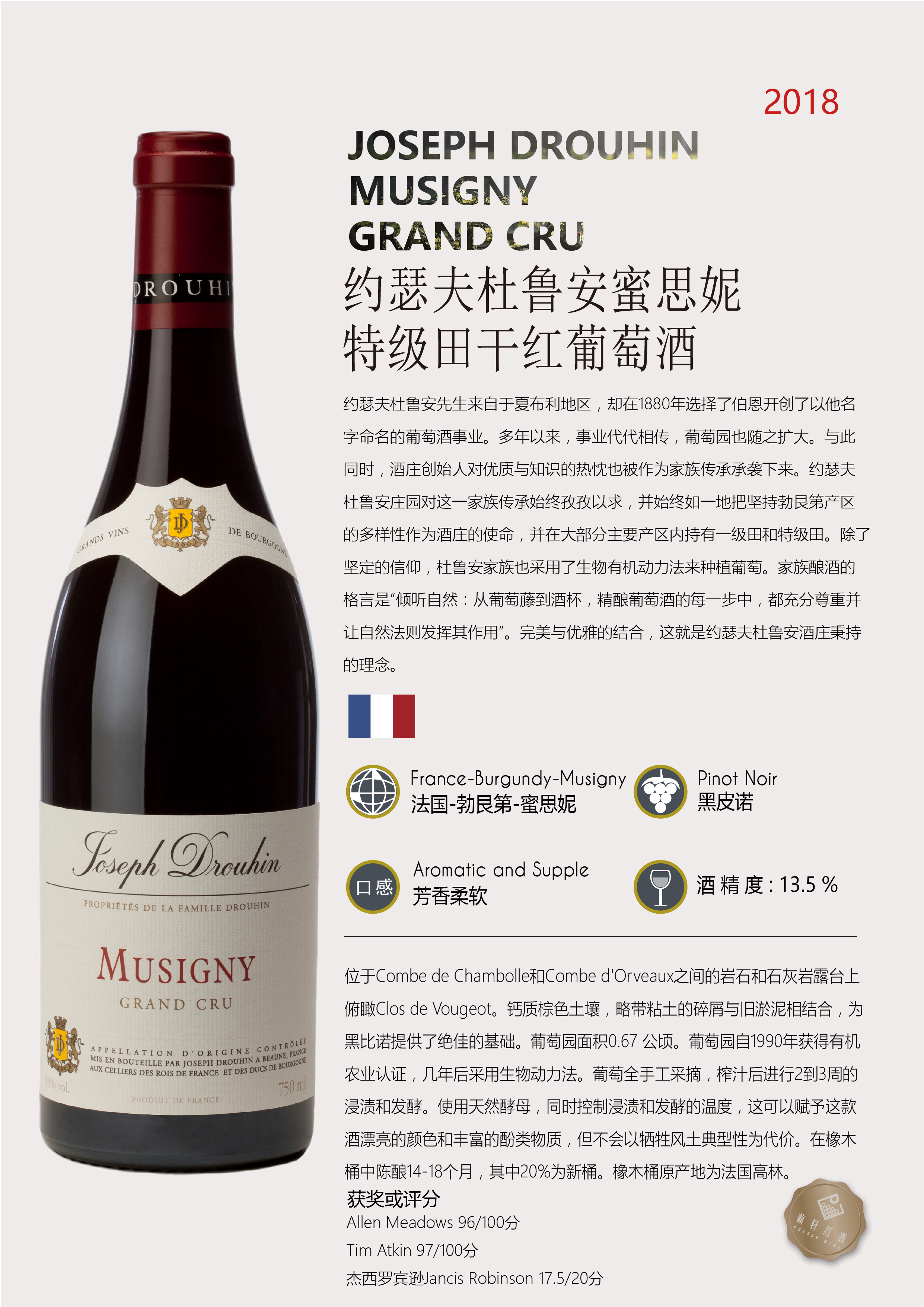 卖点 | 巴黎多家米其林三星餐厅酒单常备款。法国航空、新加坡航空、全日空的头等舱用酒。 | 级别 | 特级田Grand Cru | 酸度 | |