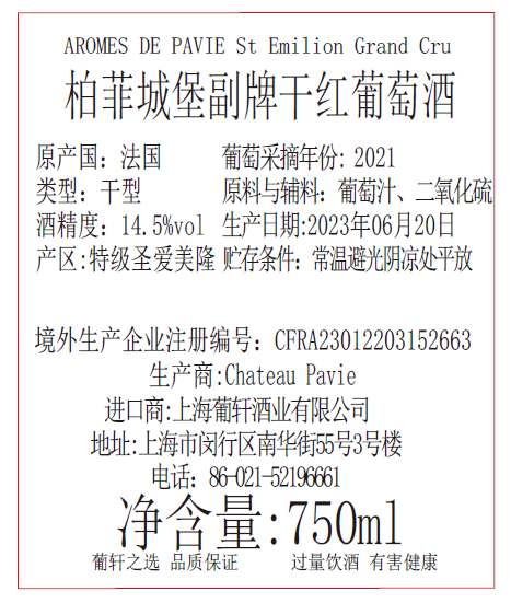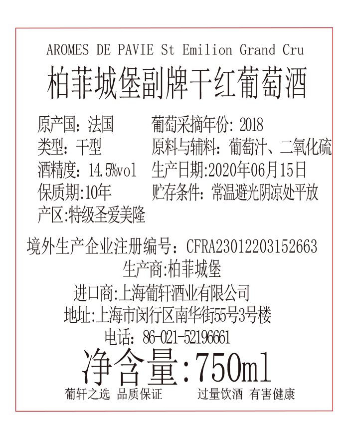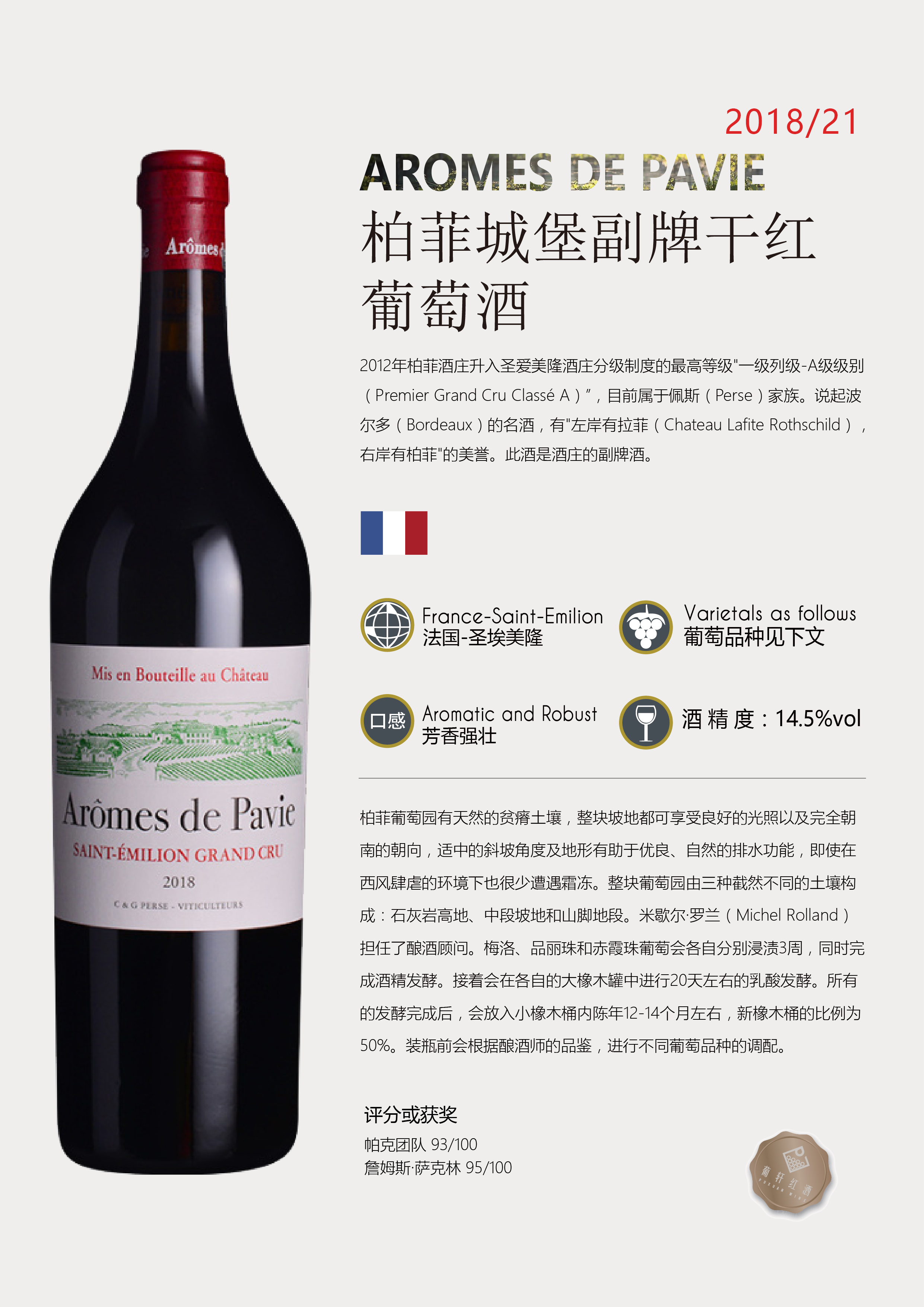 葡萄品种 | 美乐 Merlot, 品丽珠 Cabernet Franc 赤霞珠 Cabernet Sauvignon | 酒精度 | 14.5% | 酒体 | 中等 |