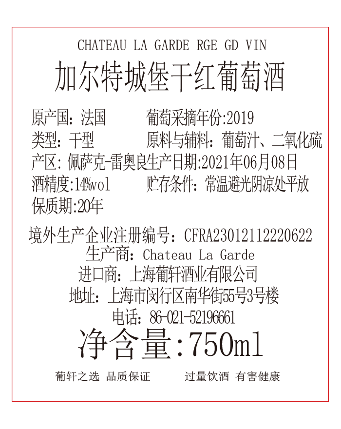 橡木桶陈酿时间 | 12个月 | 葡萄采摘年份 | 2019年 | 产品类型 | 干红葡萄酒 |
