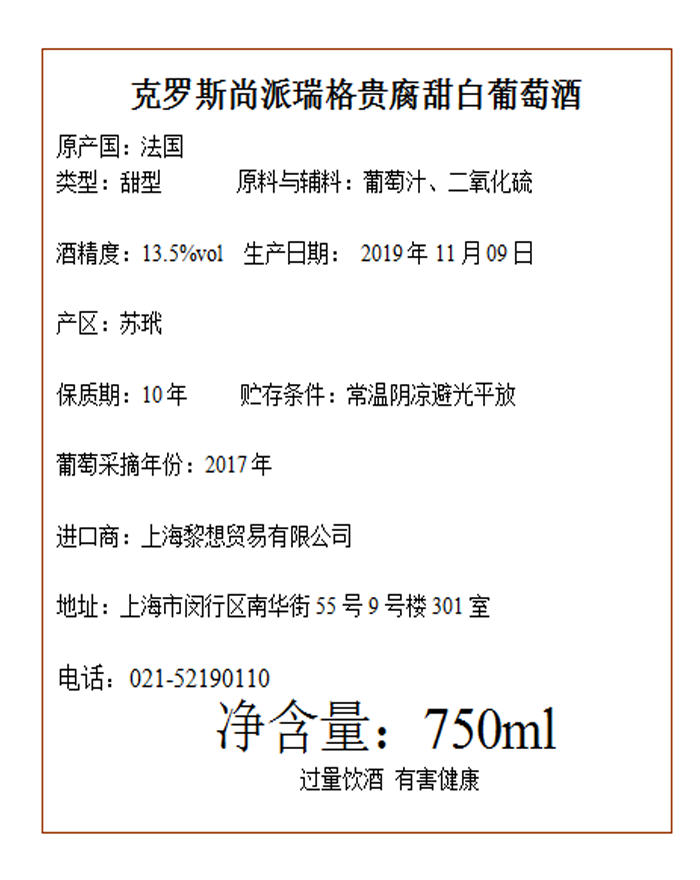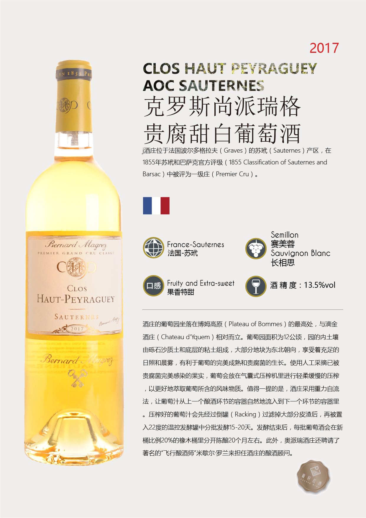 卖点 | 1855年苏玳和巴萨克官方评级(1855 Classification of Sauternes and Barsac)中被评为一级庄(Premier Cru) | 级别 | AOC | 酸度 | 中等 |