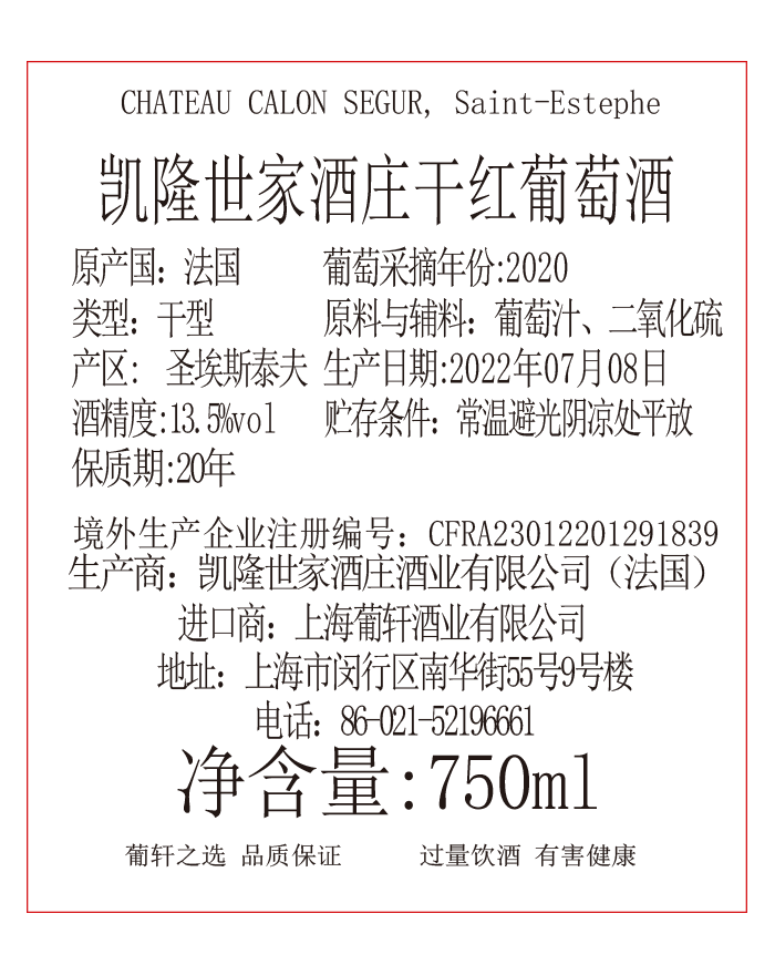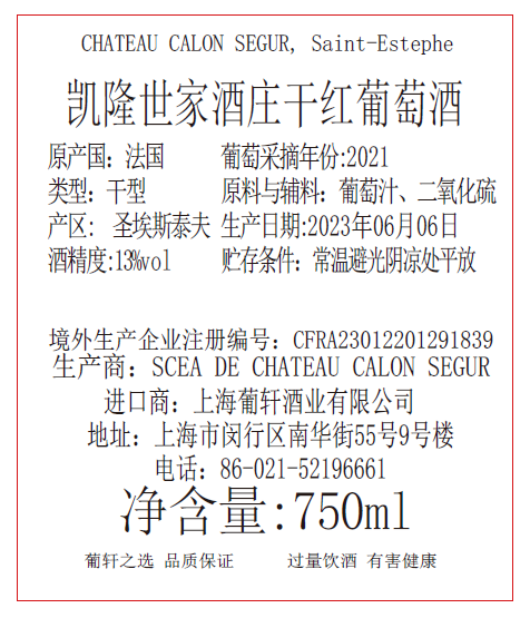 酒体颜色 | 石榴石红色 | 包装规格 | 6/木箱 | 口感 | 芳香强壮 |