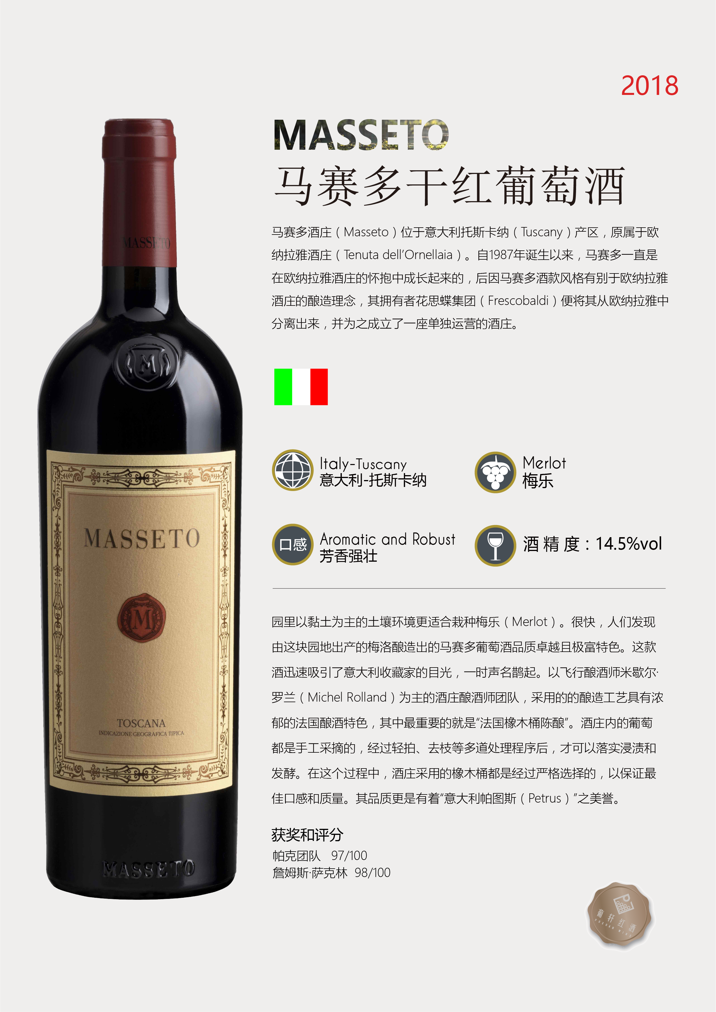 品饮记录 | 这款酒由100%梅乐酿造而成,酒液呈深宝石红或深紫红色,常伴有黑莓和黑醋栗等果香,有时还会伴有烘烤咖啡和香草味,酒体中等,架构坚实,余味优雅悠长,陈年潜力十分优秀。它优异的品质使它获得了许多酒评家的青睐,詹姆斯·萨克林(James Suckling)曾专门撰文夸赞过马赛多,称其“足以与帕图斯(Petrus)和里鹏(Le Pin)等传奇葡萄酒相媲美”。 |