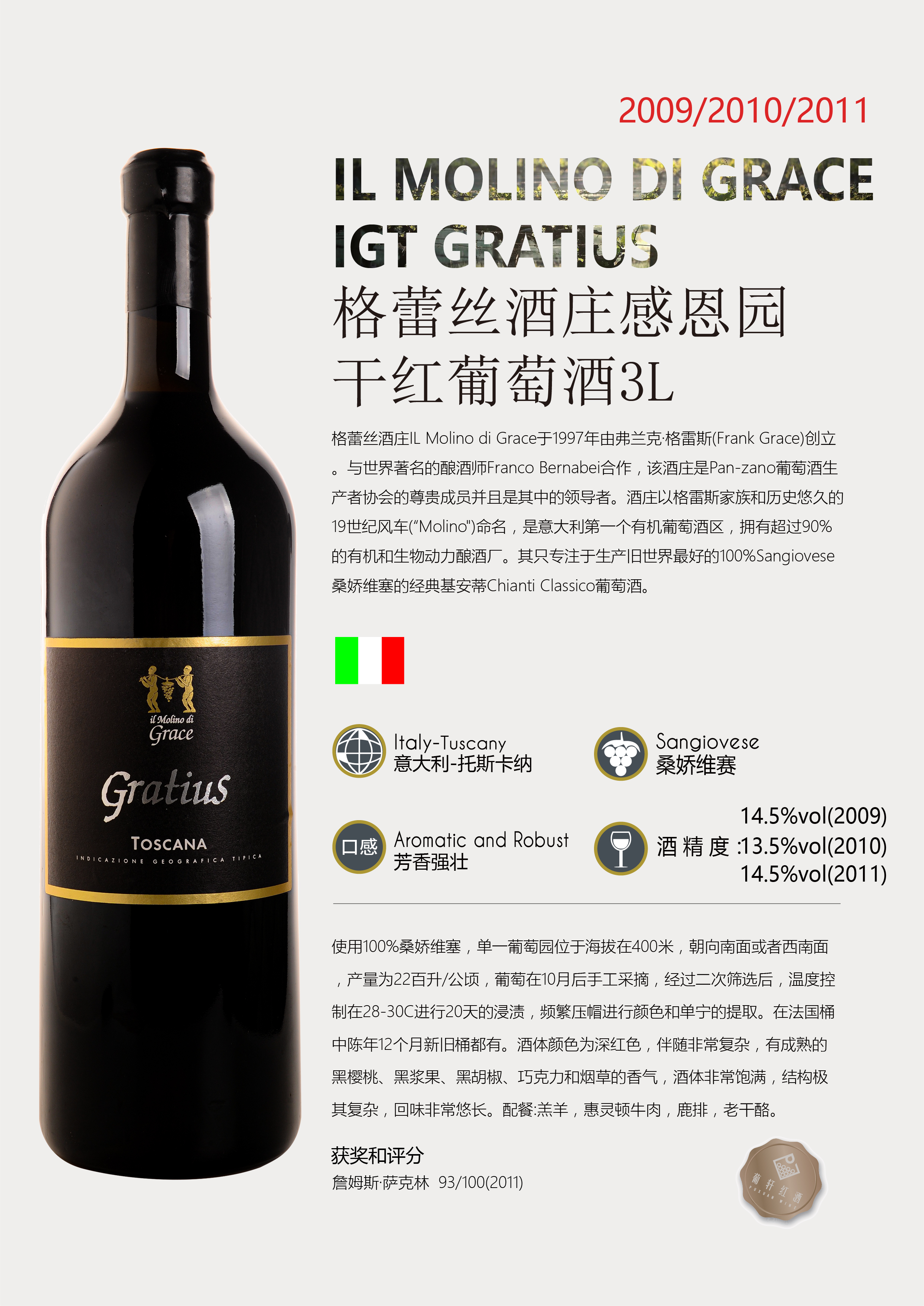 卖点 | 家族葡萄园:这个单一葡萄园名为 Gratius (which means "thankful" 感恩). | 级别 | IGT | 酸度 | |
