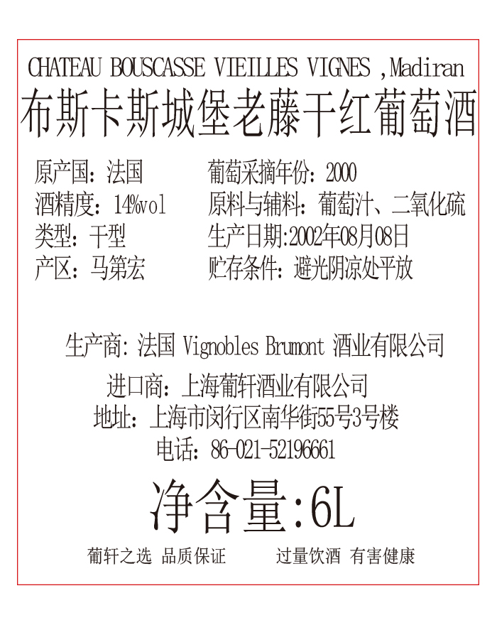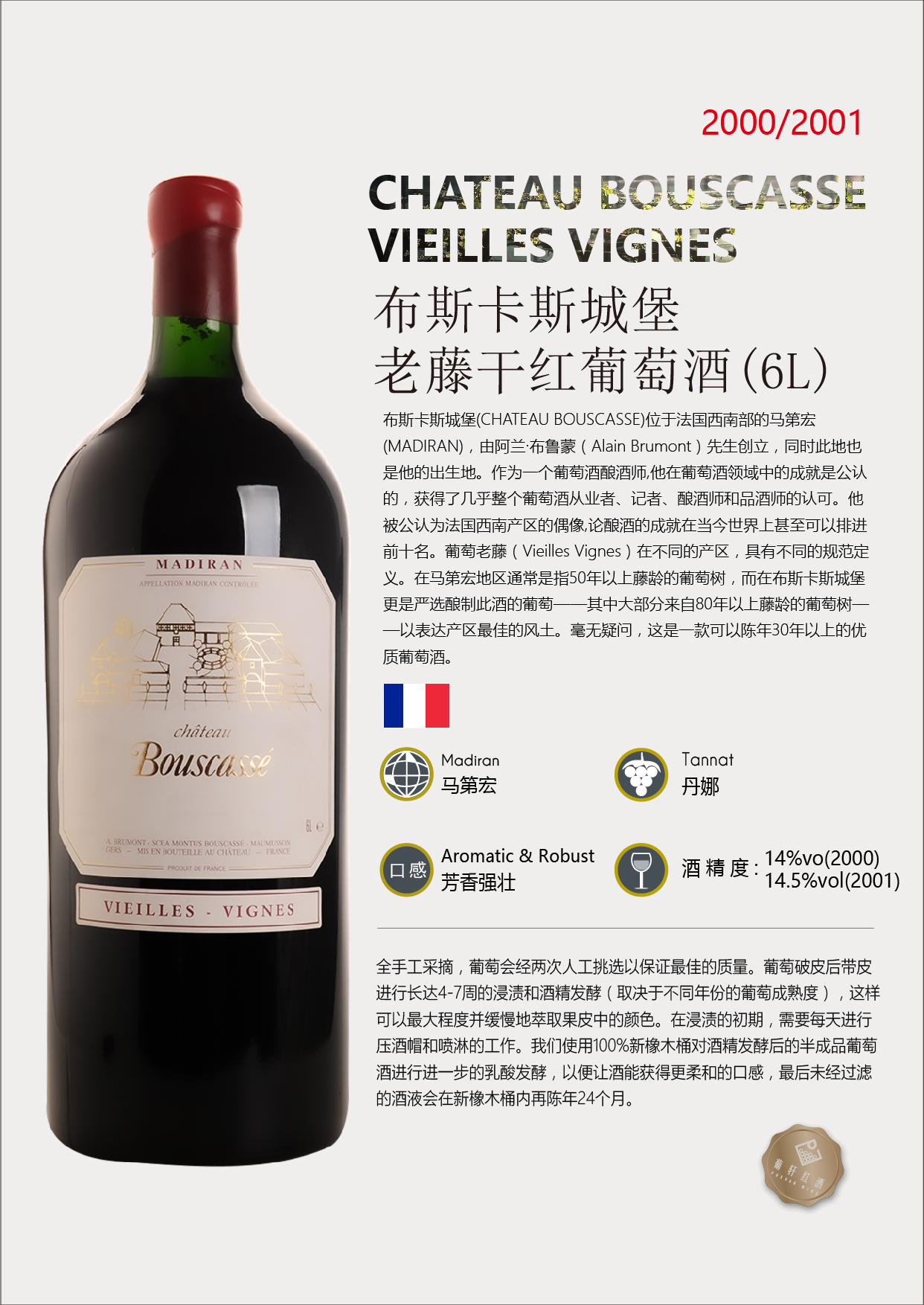 橡木桶陈酿时间 | 24个月 | 葡萄采摘年份 | 2001/2000 | 产品类型 | 干红葡萄酒 |